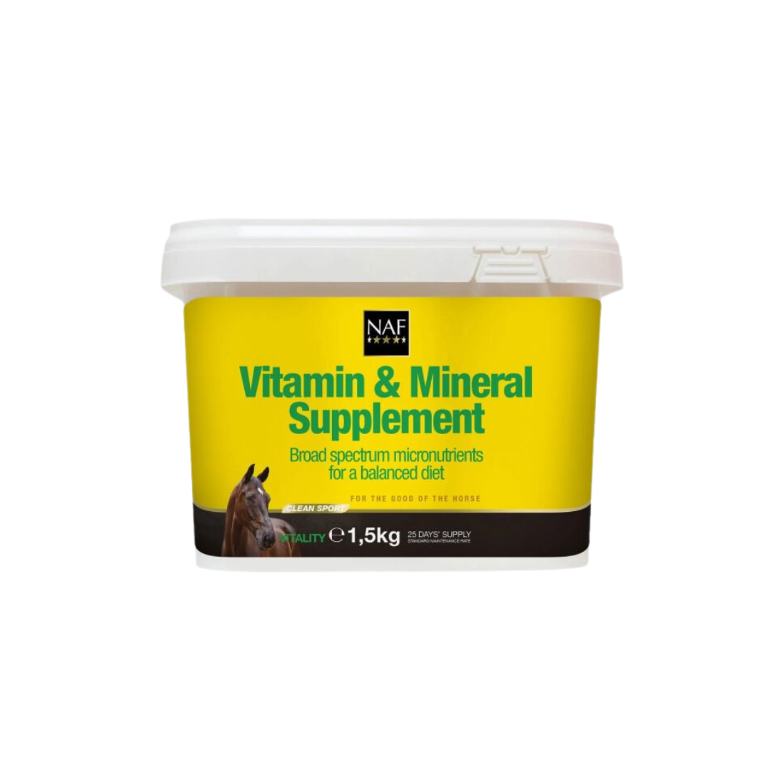 NAF Vitamin and Mineral Supplement (General Purpose Supplement) to starannie zbilansowana mieszanka witamin, minerałów oraz pierwiastków śladowych. Preparat polecany jest dla koni w każdym typie użytkowania – zarówno pracujących w lekkim i intensywnym treningu, jak i dla koni odpoczywających, starszych czy w okresie rekonwalescencji. Może być również bezpiecznie stosowany u klaczy w okresie ciąży.